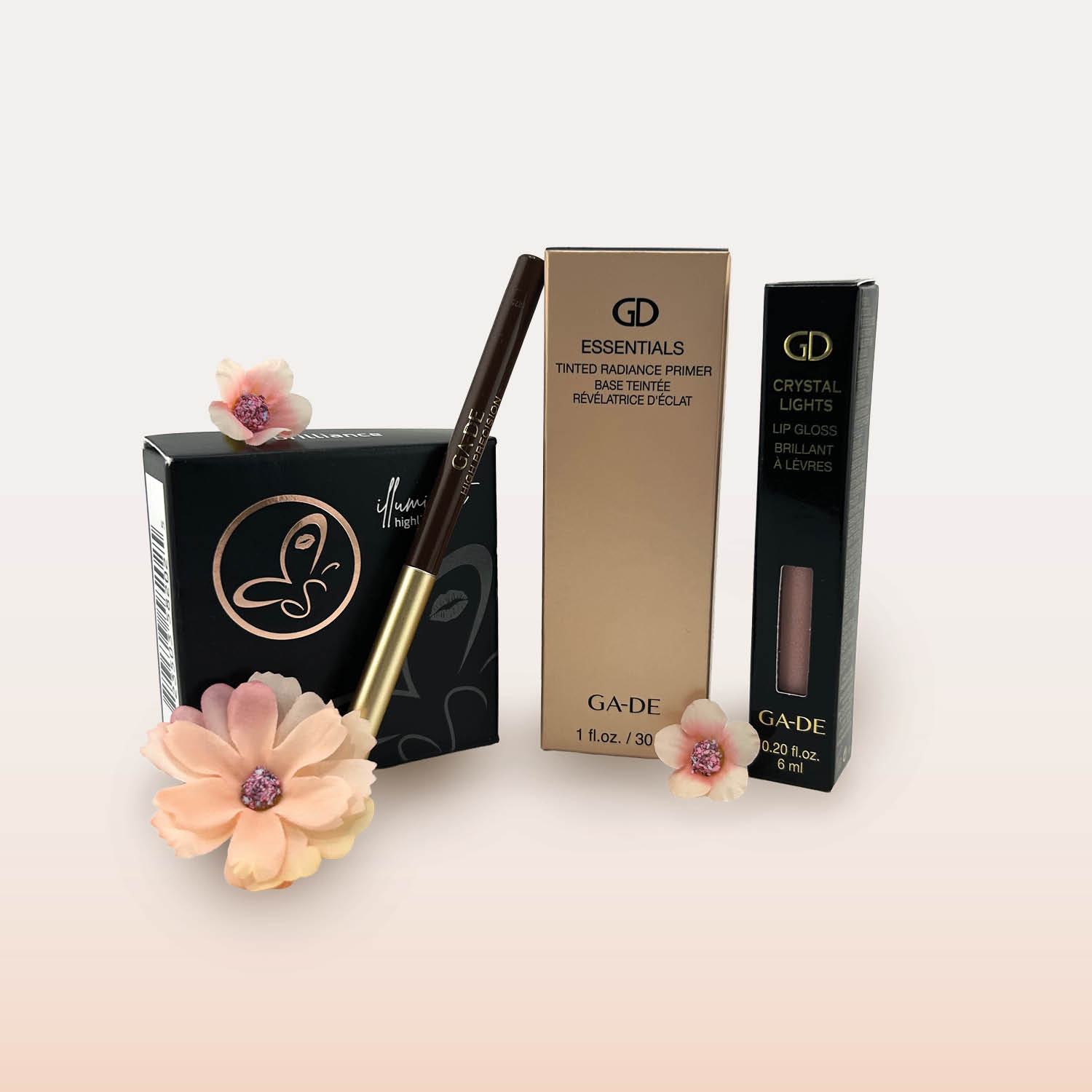 This beautiful makeup gift package includes a tinted radiant primer, a highligher, a brown eyliner, and the perfect soft pink lip gloss.